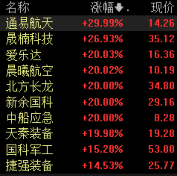 4月9日盘中,军工板块持续走强,截至发稿,通易航天30%涨停,晟楠科技涨超26%,爱乐达、晨曦航空、北方长龙等多股20%涨停。中箭红兵、长城军工等10余股涨停。