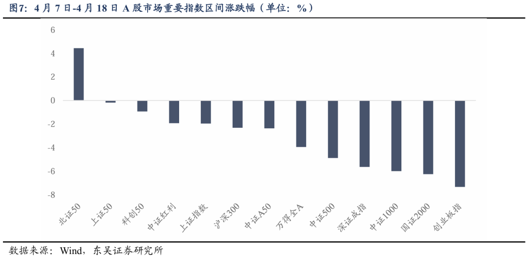 分指数看,近两周(4/7-4/18,后同)A股重要指数中,除北证50在活跃资金拉动下上涨4.4%外,其余指数均不同程度调整,其中上证50最为扛跌,跌幅为0.2%。东吴证券认为,上证50是本轮最受益于ETF增量资金的指数。一是由于上证50成分股作为沪深300的核心构成,在沪深300中的权重接近40%,这意味着稳市资金的1901亿元中至少约有34%流入了上证50成分股;二是鉴于其作为大盘蓝筹核心指数,博弈性质偏弱、筹码结构相对健康,资金拉动效率更高。