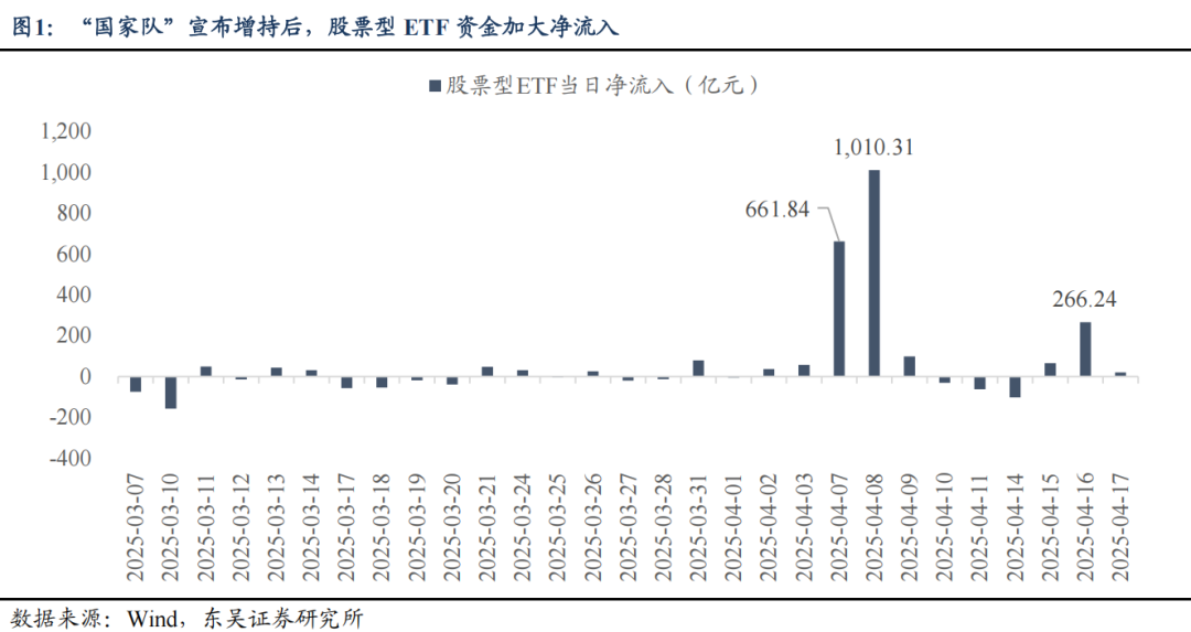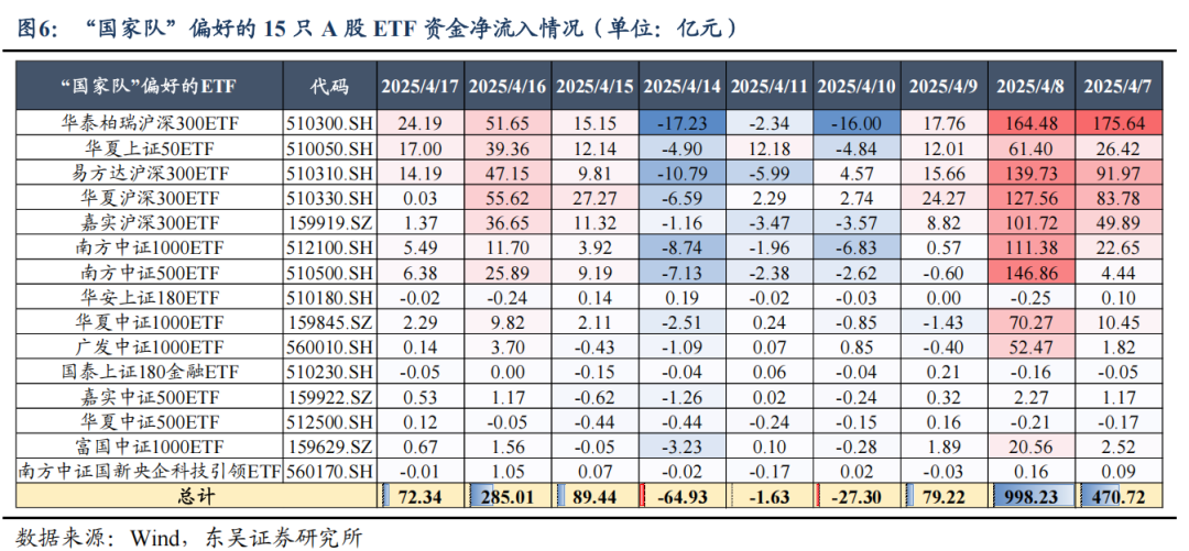 若以24Q4“国家队”持仓占比≥40%为标准筛选出“国家队”所偏好的15只ETF,以其资金流来衡量稳市资金体量,则4月7日-17日期间“国家队”共计净流入约1901亿元。