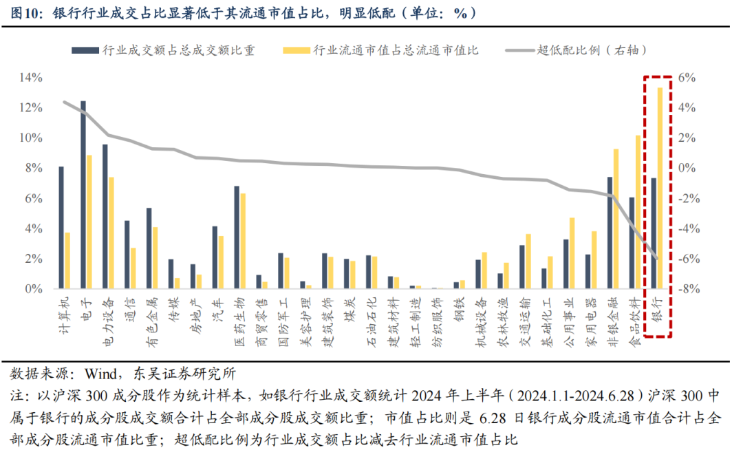 另一方面,以银行为代表的权重行业则明显受益于“国家队”的买入。本轮银行上涨背后的资金面逻辑与 2024 年前三季度红利风格的极致演绎存在相似之处,ETF资金的大幅流入是银行取得超额收益的重要力量。东吴证券在报告《ETF投资范式崛起,如何影响A股定价?》中指出,在沪深300、上证50等大盘蓝筹核心指数中,银行占比较高,增量资金以ETF的形式流入将对银行板块形成明显超配;此外,由于银行成交额偏低而市值最大,因此少量资金就能对板块形成有效拉动。