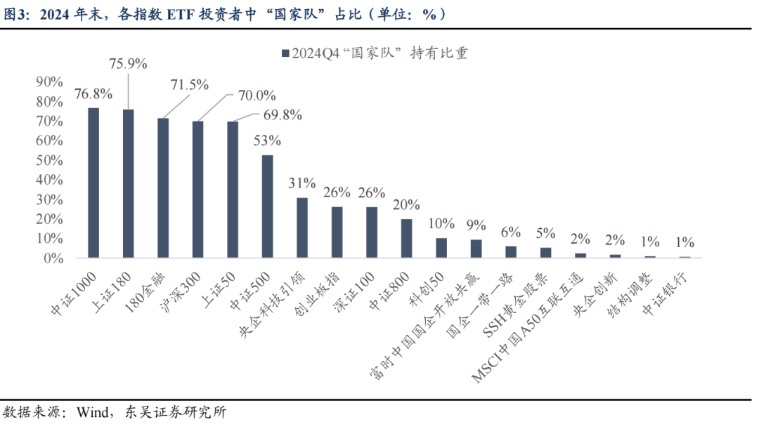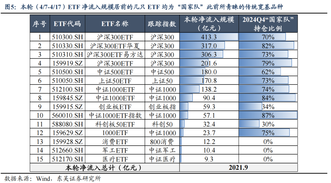 本轮ETF增量资金基本均流入“国家队”所偏好的传统宽基品种。基于基金年报前十大持有人数据,过去“国家队”主要偏好沪深300、上证50等核心宽基。截至2024年底,沪深300、上证50、中证1000、中证500、创业板指的“国家队”持仓规模居前,分别为6893、1114、902、748、333亿元;持仓比重方面,中证1000、上证180、180金融、沪深300、上证50ETF的持有者中“国家队”占比均高于或接近70%。从本轮(4/7-4/17)ETF增量资金的结构来看,沪深300、中证1000、中证500、上证50分别占64%、16%、9.4%、9.3%。净流入规模居前的几只ETF均为“国家队”此前所青睐的传统宽基品种。