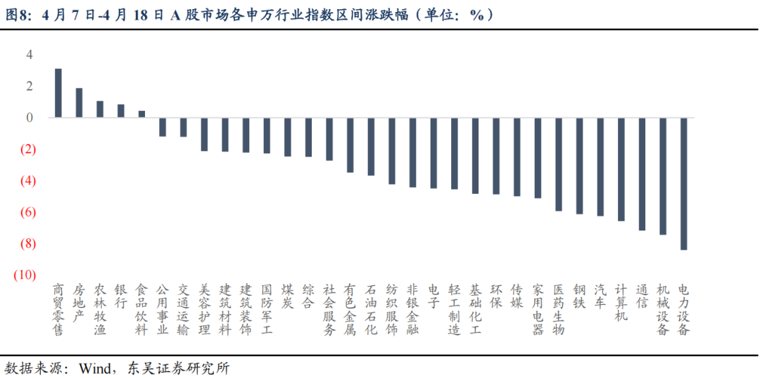 一方面,活跃资金积极交易内循环、反关税板块。随着贸易摩擦快速升级,关税反制、提振内需的逻辑得到强化,活跃资金的积极定价使得相关行业跑出明显超额。东吴证券用龙虎榜日均上榜比例(个股龙虎榜上榜次数/行业个股总数量)来刻画活跃资金的行为,4月7日至17日,农林牧渔上榜比例为全行业最高,达到12.6%,较一季度提升12pct;商贸零售上榜比例仅次于农林牧渔,为5.9%。对应到市场表现上,商贸零售、农林牧渔近两周分别上涨1.1%、3.1%,相对全A实现7.1pct、5pct的超额。