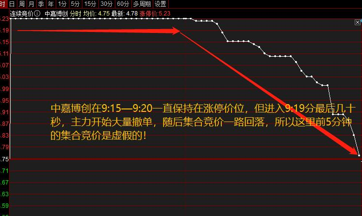1、9:15—9:20 是可以挂单也可以撤单,比如:中嘉博创在 9:15—9:20 一直保持在涨停价位,但进入 9:19 分最后几十秒,主力开始大量撤单,随后集合竞价一路回落,所以这里前 5 分钟的集合竞价是虚假的!