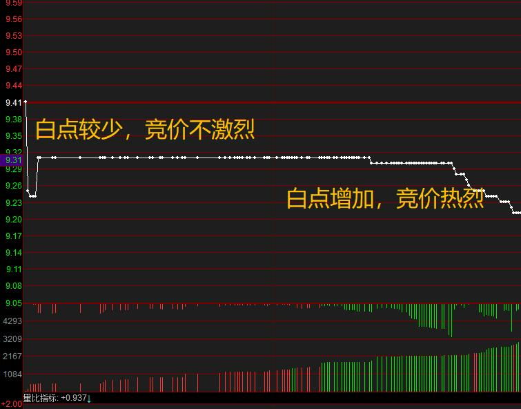 在集合竞价图中一个白点代表一个竞价,白点越多越密集,说明竞价积极,表示这个股票越活跃。