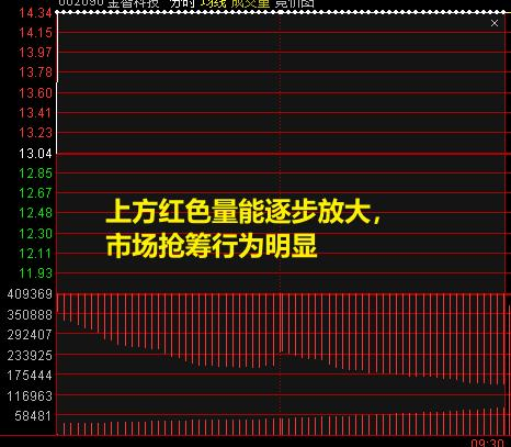 2、9:20之后成交量逐渐缓慢放大,且红柱子为主,最好每个柱子间没有空隙,也就是密集成交。成交量时时在放大。