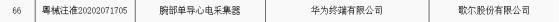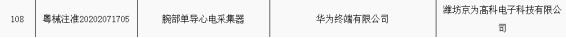 10月8日,广东省药品监督管理局网站发布截至当天的《广东省医疗器械注册人制度试点批准产品名单》显示,华为终端有限公司的腕部单导心电采集器正式获批生产,注册证号为“粤械注准20202071705”,受托人为歌尔股份有限公司以及潍坊京为高科电子科技有限公司。