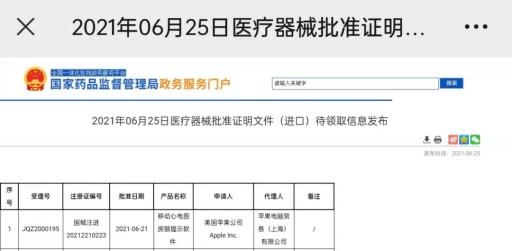 值得注意的是,6月25日,国家药品监督管理局网站发布医疗器械批准证明文件(进口)待领取信息,其中第一项是美国苹果公司(Apple Inc。)的移动心电图房颤提示软件,注册证编号为“国械注进 20212210223”。