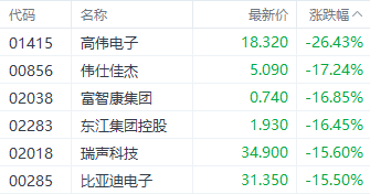 受特朗普关税政策影响,港股苹果概念股今日延续调整。截至发稿,高伟电子(01415.HK)、富智康集团(02038.HK)、瑞声科技(02018.HK)、比亚迪电子(00285.HK)分别下跌26.43%、16.85%、15.60%、15.50%。