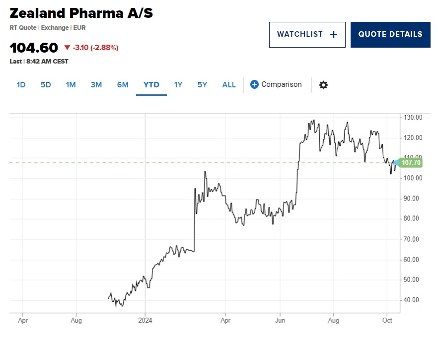 Zealand Pharma成立于近三十年前,专注于多肽药物,近几个月来,随着它进一步涉足肥胖治疗领域,公司的发展势头越来越好。今年迄今为止,其股价在欧洲股市上涨了110%以上,主要受到多个减肥药管道的积极研发进程带来的强大催化。