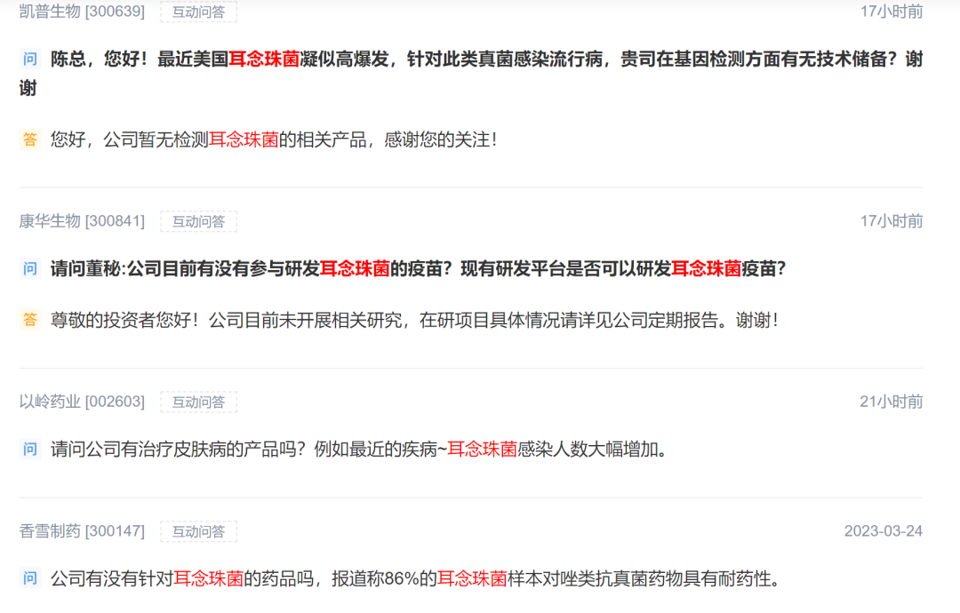 耳念珠菌在美国的暴发也引发投资者强烈关注,记者在深交所互动易以“耳念珠菌”为关键词,共搜索到11条相关问答。其中,有两家公司澄清公司并无相关产品。