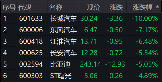 汽车整车板块午后跌幅扩大,长城汽车跌停,东风汽车、江淮汽车、长安汽车、比亚迪跌超5%。