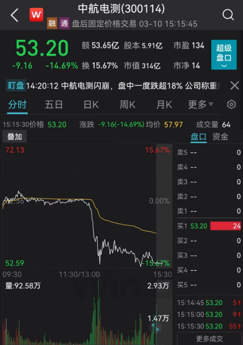 今日早盘才创出历史新高的中航电测,午后出现闪崩,一度跌超15%,成交额超53亿元。