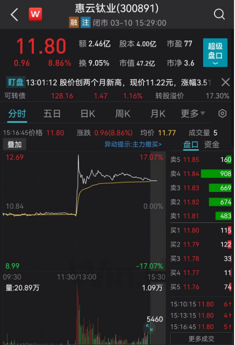 钛白粉概念股午后异动,惠云钛业直线拉升涨超15%,收涨近9%。