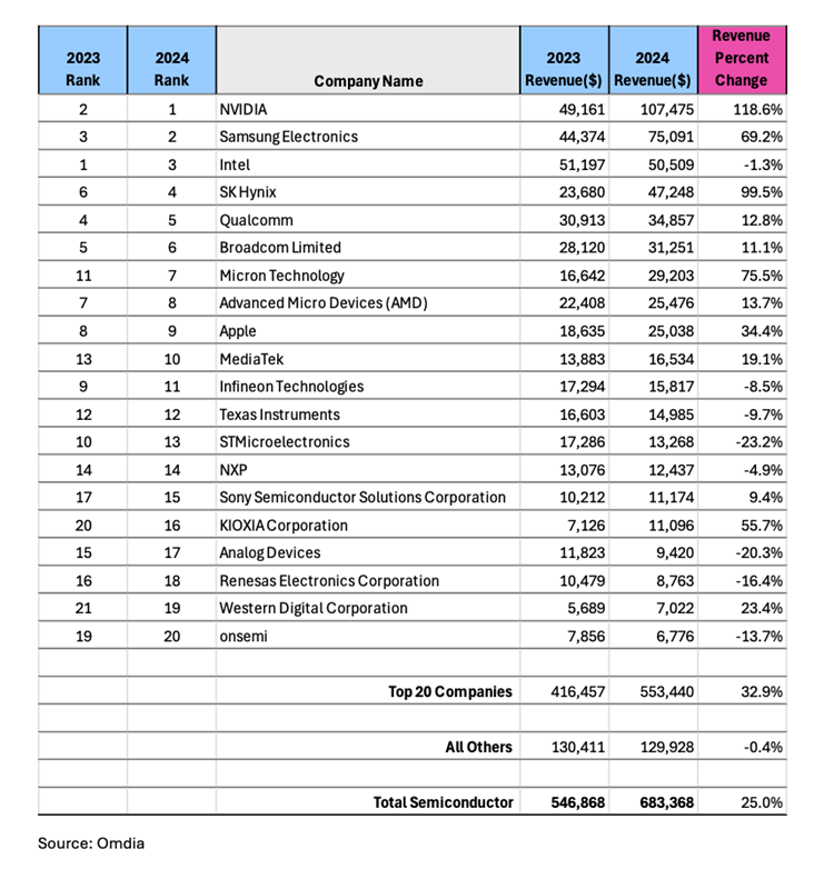 英伟达在人工智能驱动的GPU领域的主导地位,使其在半导体公司收入排名中跃居首位,超过了2023年排名第一的三星。
