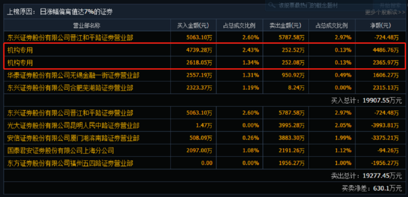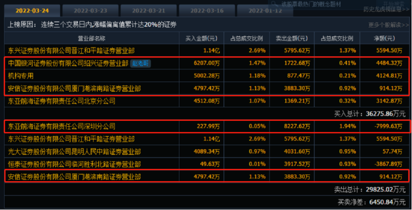 同时公布的三日榜数据显示,龙虎榜资金净买入6450万元。机构专用位列买三席位,知名游资“赵老哥”、东亚前海证券深圳分公司位列买二和卖一席位。另外,一线游资安信证券厦门湖滨南路位列买四和卖五席位,买入4797万元的同时并卖出3883万元。