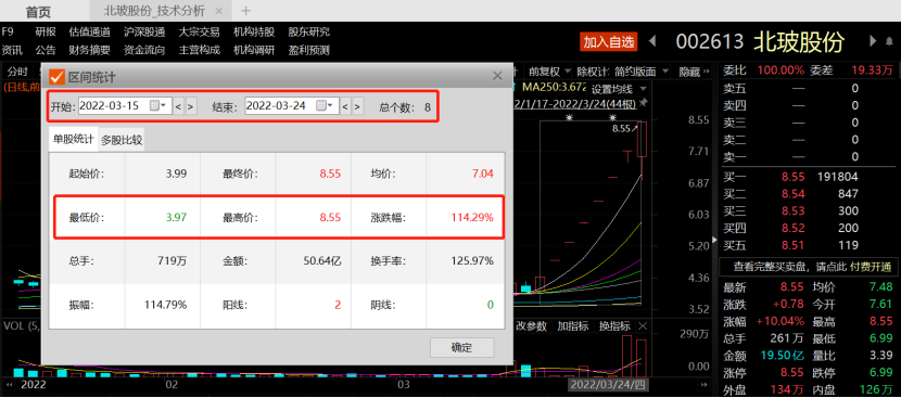 值得注意的是,北玻股份不仅录得八连板,还成为近三个月来两市连板最高标,累计涨幅高达115.37%。