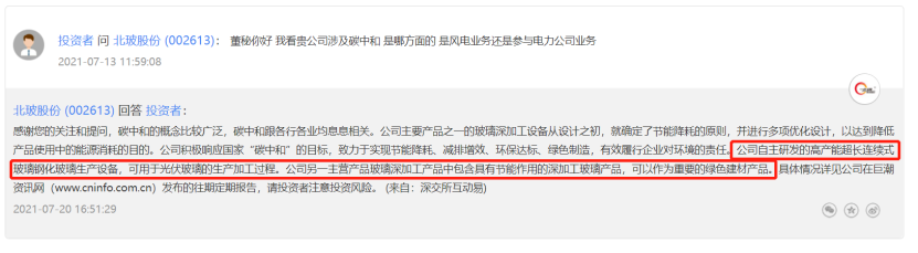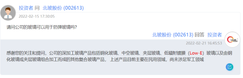 北玻股份在互动易上回复称,公司的深加工玻璃产品包括钢化玻璃、低辐射镀膜(Low-E)玻璃等产品。公司另一主营产品玻璃深加工产品中包含具有节能作用的深加工玻璃产品,可以作为重要的绿色建材产品。