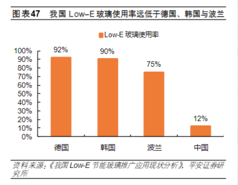 据平安证券研报数据,现阶段中国的Low-E玻璃使用率仅为12%。目前发达国家使用比例基本超过80%,其中德国的普及率接近超90%。