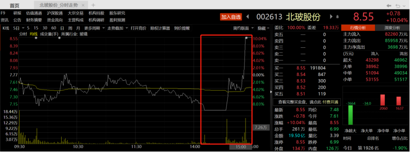 建筑节能概念股北玻股份尾盘一度封死跌停,14时33分打开跌停后两波放量凌厉上拉并于14时53分封住涨停直至收盘,上演“地天板”走势。全天成交额超19亿元,换手率高达45.64%。
