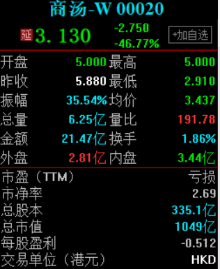 6月30日,港股商汤-W早盘暴跌。截至发稿,跌超46%,报3.13港元,股价创历史新低。