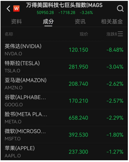 美股大型科技股走弱。Wind数据显示,截至收盘,万得美国科技七巨头指数跌3.26%,创下三个多月以来新低;除英伟达外,特斯拉跌超3%,亚马逊、Meta均跌超2%,微软、苹果跌超1%。