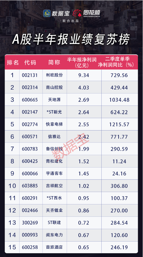 二季度一批上市公司业绩迎来拐点,数据宝推出《A股半年报业绩复苏榜》,按照以下条件选取中报迎来业绩拐点的50家公司:1、一季度亏损、中报盈利;2、中报净利润同比增幅大于30%;3、二季度单季营收同比及环比增幅均大于0;4、二季度单季净利润同比增幅大于0;5、非6月30日之后上市的新股。