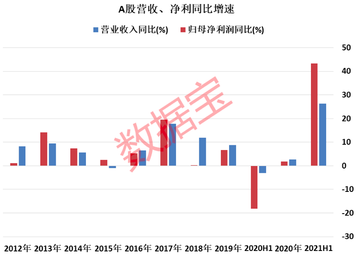 数据宝统计,上半年A股公司累计实现总营收30.55万亿元,同比增长26.21%,累计实现净利润2.76万亿元,同比增长43.65%。营收和净利增幅双双创历史同期最高水平。