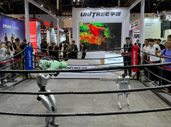记者来到WAIC智能终端馆,仿佛置身于2050年的未来世界:人形机器人艺术表演、格斗、运动项目随时可见,它们会像“老熟人”一样自然地走到观众的身边,机器狗在展馆里不定时巡逻。智能眼镜成为本次展会上的“新宠儿”,XREAL、Rokid、李未可科技等智能眼镜展台前围满了观众,观众除了体验展商带来的新品AR、AI眼镜,还感受到了AI、AR与现实世界的融合。