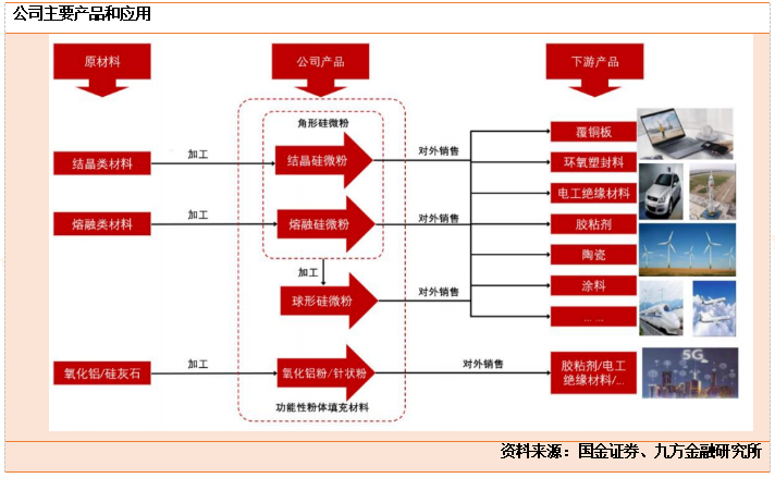 公司致力于无机填料和颗粒载体行业产品的研发,以硅基氧化物填料、铝基氧化物球形填料为核心产品的功能性陶瓷粉体填料,可应用于电子电路基板、芯片封装材料、新型绝缘制品、导热界面材料、胶粘剂、蜂窝陶瓷、3D打印、齿科材料等领域,终端服务于5G装备、消费电子、汽车工业、航空航天、特高压传输等行业。公司主营产品包括结晶、熔融和球形硅微粉(结晶和熔融硅微粉均属于角形硅微粉)。