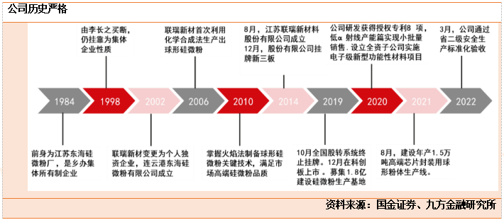 公司成立于1984年,前身为硅微粉厂,2002年公司成为李长之先生的个人独资企业,同年生益科技与硅微粉厂合资成立东海硅微粉有限公司。2014年公司完成股份制改造并挂牌新三板,2019年登陆科创板。公司深耕硅微粉行业,专注于电子级硅微粉产品的研发、生产和销售。