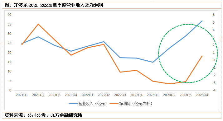 江波龙2023年营业收入100-105亿元人民币,同比增长20%-26%;归属净利润亏损8-8.6亿元人民币;单季度看,2023Q4实现营业收入35-40亿元人民币,同比上升超过100%,环比上升超过20%;2023Q4归属净利润约0.23-0.83亿元人民币,实现扭亏为盈。如下图,我们可以看到,江波龙营收及净利润在2023年下半年以来出现很明显的拐头现象,或表明2021Q2后的趋势下行已经随着行业逐步恢复而结束。