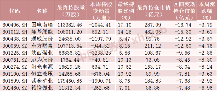 本周持仓市值减少额居前十的股票中除隆基绿能、阳光电源被北向资金分别加仓592.11万股、534.71万股外,其他股票均被减仓。其中国电南瑞、通威股份、陕西煤业、紫金矿业被北向资金减仓超1000万股。