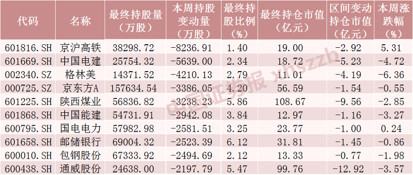 从市场表现上来看,本周北向资金减仓股数居前十股票跌多涨少,京沪高铁涨幅最大,本周上涨5.31%,格林美跌幅最大,本周下跌6.36%。