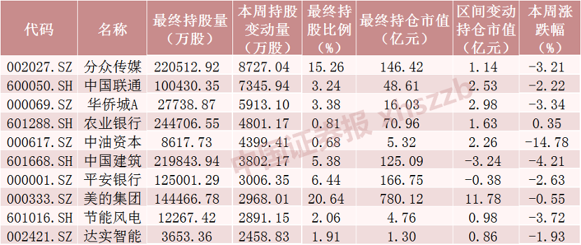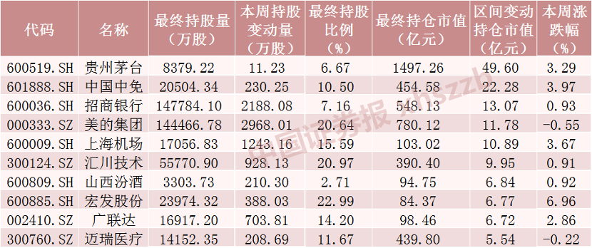 本周北向资金持仓市值增加额居前十的股票均被北向资金加仓,其中对招商银行、美的集团、上海机场的持股增加数超1000万股。