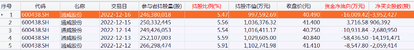 从成交均价和减仓股数来计算,通威股份为本周北向资金减仓金额最高的个股,本周减仓2197.79万股,减仓金额达9.02亿元。从明细数据来看,本周北向资金有4个交易日减仓通威股份,其中12月13日减仓超5亿元。
