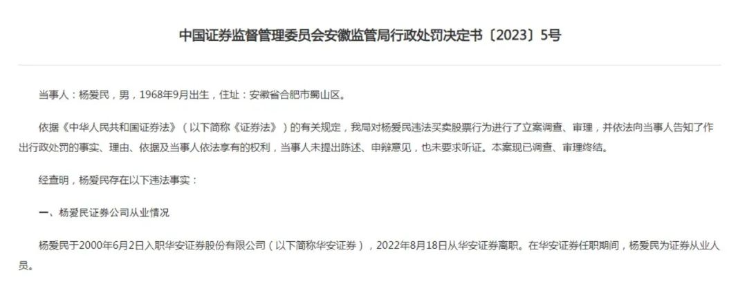 近日,安徽证监局公布了一则行政处罚公告,对华安证券原从业人员杨爱民违法买卖股票处以25万元罚款。