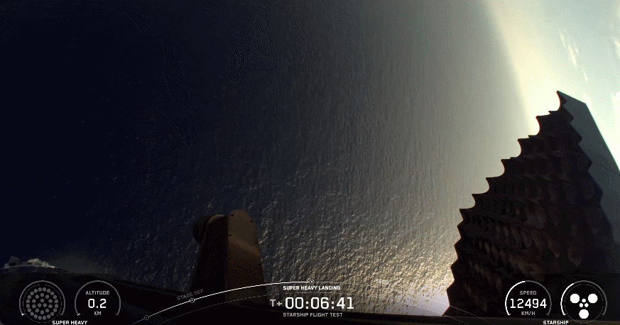 完成一、二级分离后,火箭第一级“超级重型”助推器随即展开“压力测试”——完成定向翻转动作后,测试单发失效情况下的着陆方案。在本次测试中,SpaceX故意停用了三台中心发动机中的一台,替换为10台中间环发动机中的一台。直播画面显示,助推器在墨西哥湾上空短暂悬停后,切断动力溅落海面。