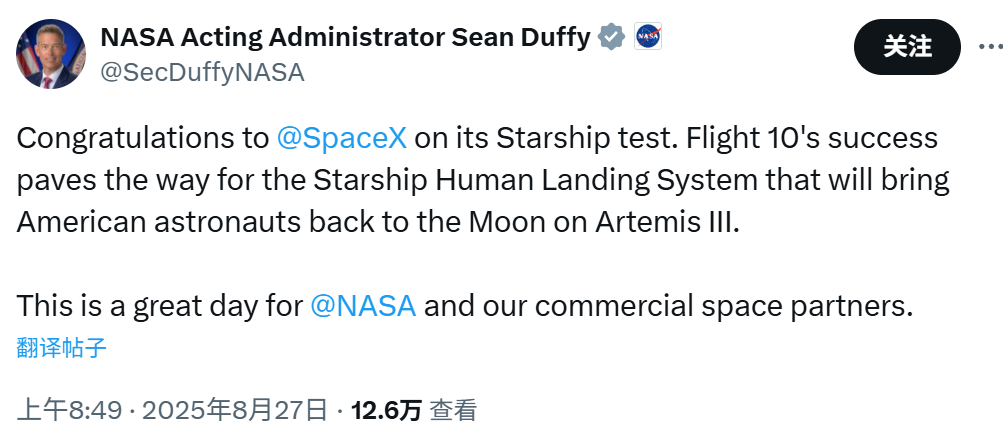 星舰“十飞”成功后,美国交通部长兼NASA代理局长肖恩·达菲将此称为“意义非凡的一天”,并表示今日的测试成功为星舰人类着陆系统铺平了道路。