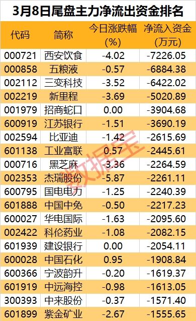 数据宝统计,尾盘3股遭主力出逃超6000万元,分别为西安饮食、五粮液、三变科技。