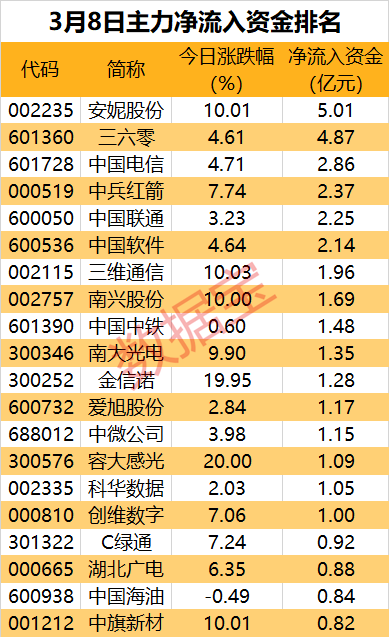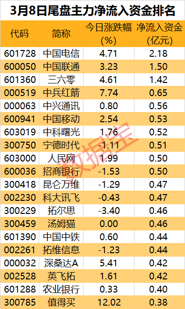 从个股看,有19股尾盘净流入资金超4000万元。3股尾盘获主力抢筹超亿元,分别为中国电信、中国联通、三六零。