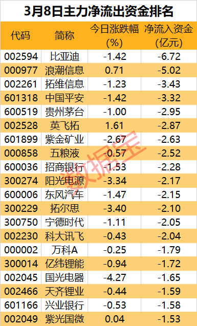 其后,净卖出居前的个股为浪潮信息、拓维信息、中国平安,净流出资金均超3亿元。