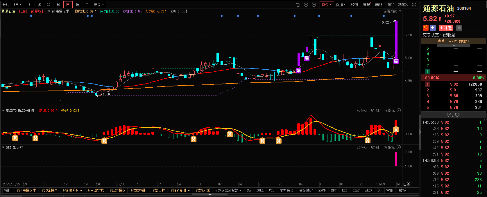 3)参考技术指标:通源石油-经伟操盘术指标-出现爆点信号
