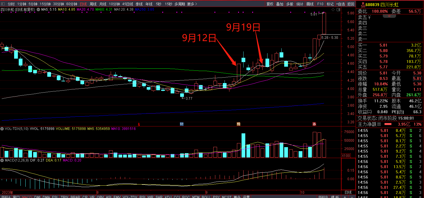接着是我们9月19日文章更进一步解析,只盯着四川长虹即可,下图所示: