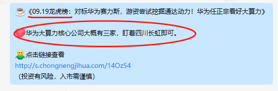 四川长虹3天2板再破新高,该股是我们的老生常谈了,它的逻辑也很清晰,最近两次对四川长虹的解析9月12文章《09.12龙虎榜:资金扎堆华为算力产业链,这些细分领域受追捧》。