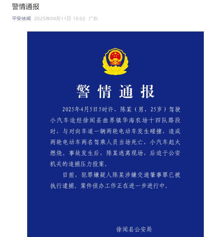 此前,据平安徐闻微信公众号消息,4月11日,广东湛江徐闻县公安局通报:2025年4月5日5时许,陈某(男,25岁)驾驶小汽车途经徐闻县曲界镇华海农场十四队路段时,与对向车道一辆两轮电动车发生碰撞,造成两轮电动车两名驾乘人员当场死亡,小汽车起火燃烧。事故发生后,陈某逃离现场,后迫于公安机关的追捕压力投案。
