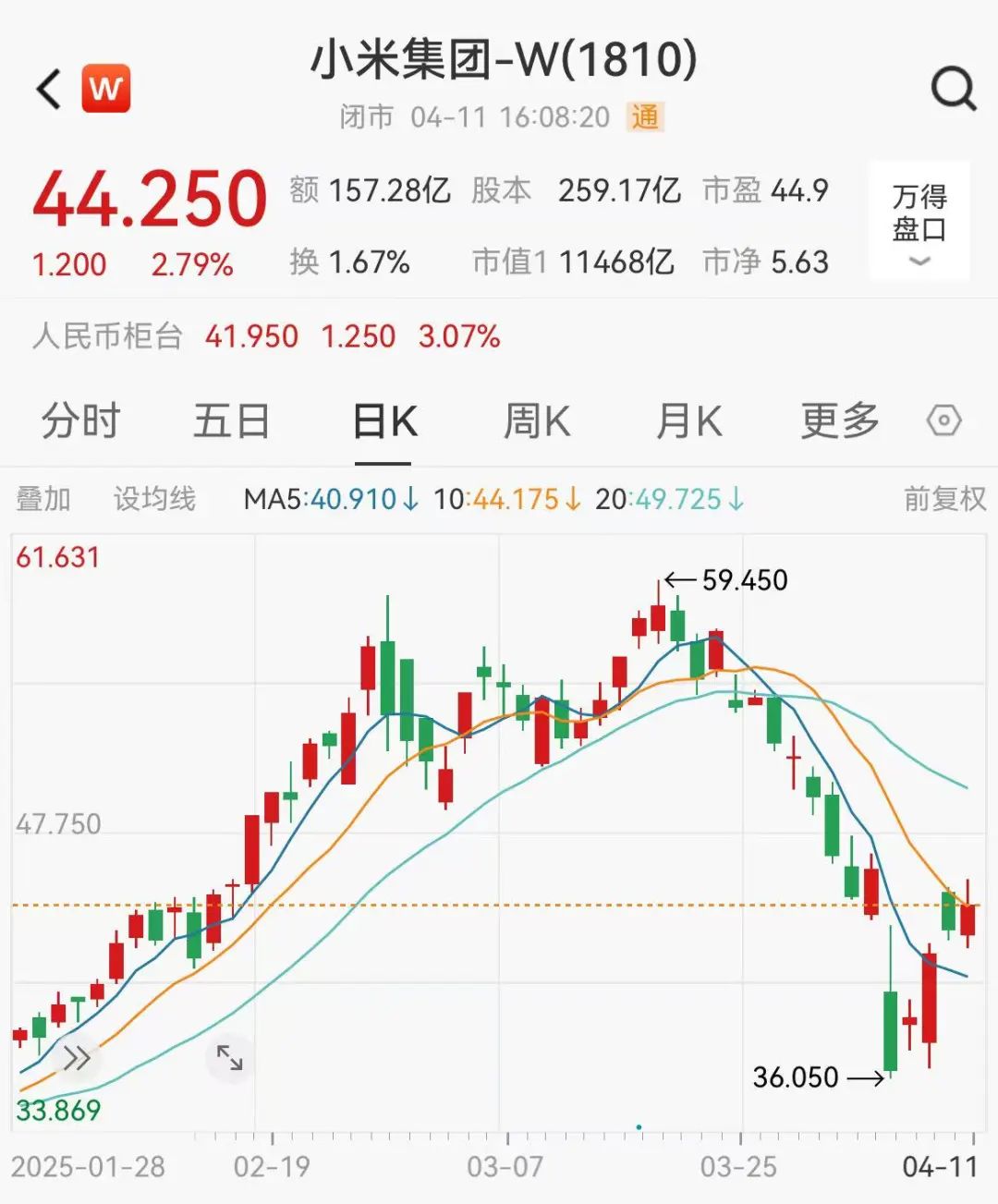 今日,小米集团股价收涨2.79%,报44.25港元/股,总市值11468亿港元。