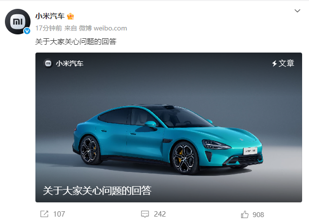 对于事故中汽车为什么会被引燃?小米汽车表示,目前,现场勘查已完成,最终结论以相关部门报告为准。据初步了解,相关火情是碰撞后电动二轮车锂电池严重挤压和变形起火,再引燃事故车辆。