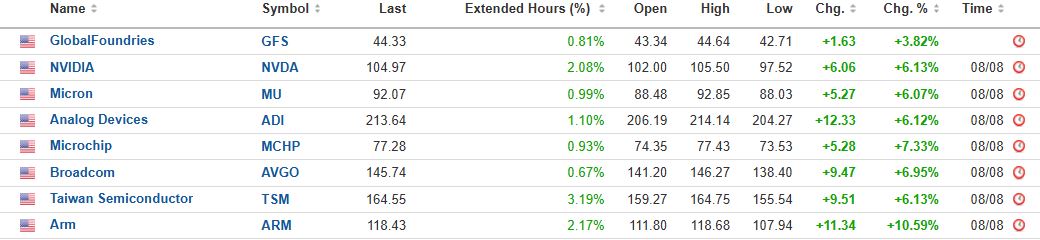 周五(8月9日),美国半导体股盘前普涨。截止发稿,英伟达涨超2%,台积电涨近3.2%,芯格上涨0.81%,美光上涨0.99%,博通上涨0.67%,Arm上涨2.17%。