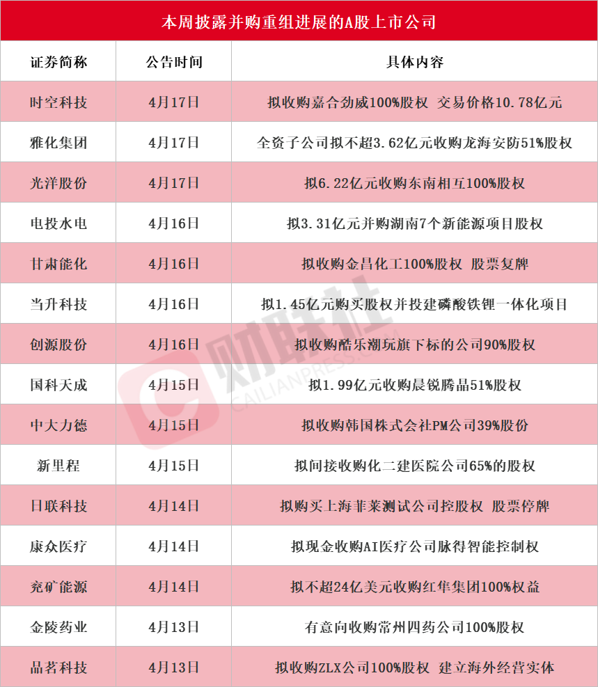 据财联社不完全统计,截至发稿,本周披露并购重组进展的A股上市公司共有15家,包括时空科技、雅化集团、光洋股份、电投水电、甘肃能化、当升科技、创源股份、国科天成、中大力德、新里程、日联科技、康众医疗、兖矿能源、金陵药业、品茗科技。具体情况如下图: