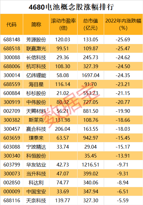 证券时报·数据宝统计,从2022年行情来看,4680电池概念股受整个电池板块回调影响,个股普跌,芳源股份、联赢激光、长信科技等概念股跌幅均超20%。部分概念股布局动作不断。